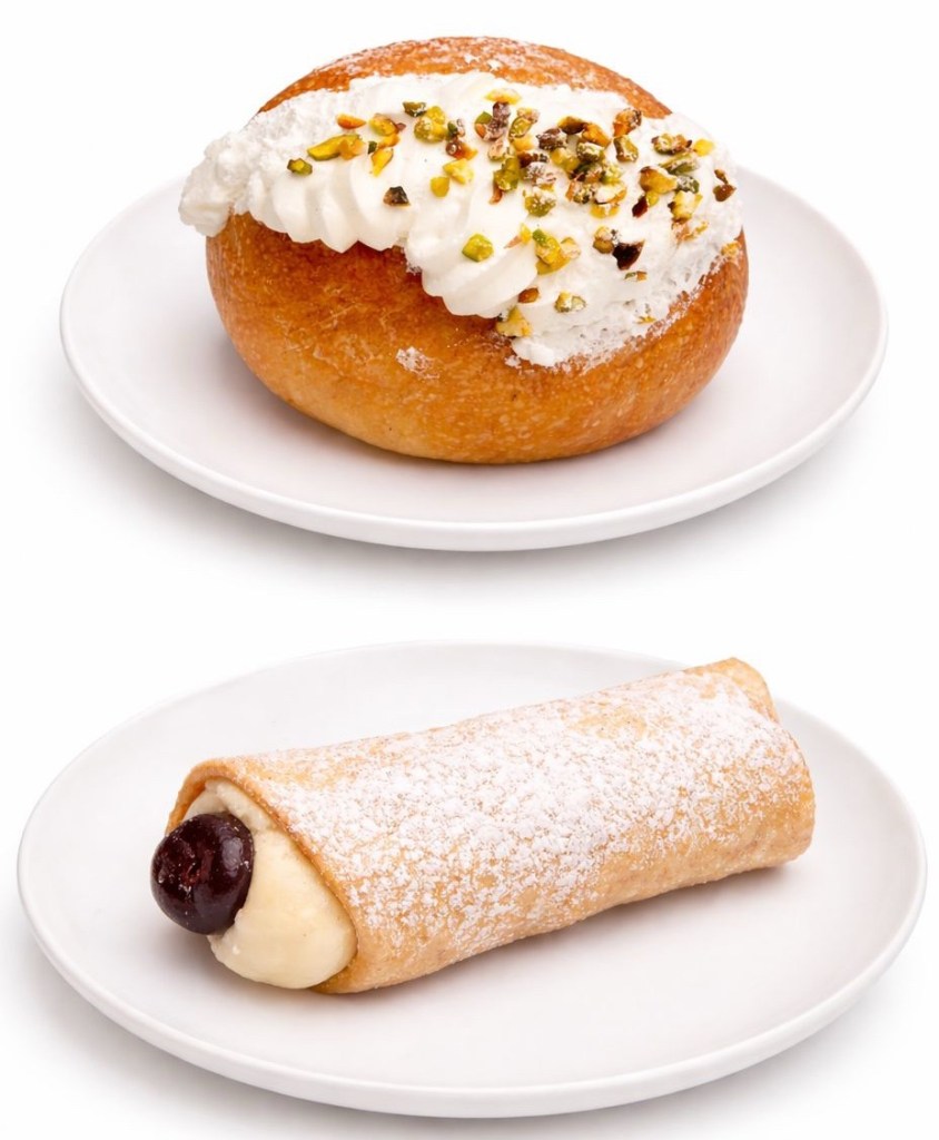 The sweet offerings were equally indulgent. A plant-based cannolo siciliano was a rare treat: a crisp, bubbly tube filled with soft, whipped custard. The pistachio cream doughnut was a delight too – split down the middle, filled with layers of light and dark crème pâtissière and topped with crushed pistachios.