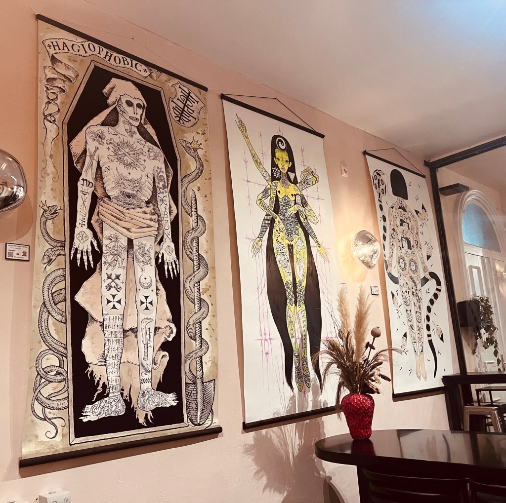 We returned the next day, this time to the venue itself, still not sure what to expect but determined to give the actual café a proper go. It’s just round the corner from the French market and the space is one many seasoned vegans will recognise immediately: that familiar combination of moral conviction and DIY charm. Posters, music photos, bright colours. A counter in the corner. A screen blocking the kitchen. A big menu board. No frills, but plenty of soul.