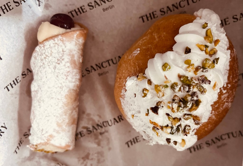 With a couple of chores completed on a cold Berlin January morning, and compacted snow crunching underfoot, I switched on HappyCow and headed for the nearest eatery. The Sanctuary sounded ideal: a vegan Italian patisserie, just nearby in Mitte, offering a balanced mix of sweet and savoury delights.