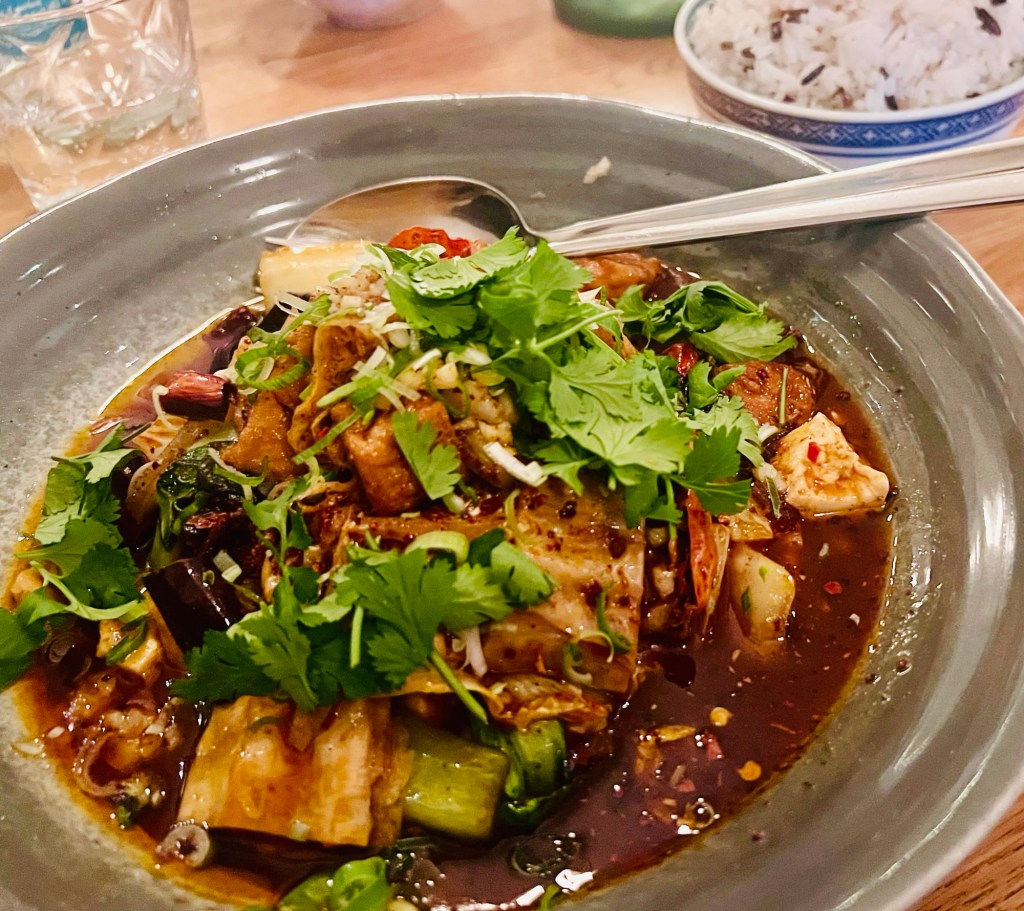 For my starter, I had the wontons in sweet chilli soy sauce, filled with what tasted like minced smoked tofu, and they were beautiful. I was worried it wouldn’t be enough, but it was perfect, particularly in the context of the next dish. My main was the Szechuan tofu pot, which genuinely surprised me with its inventiveness. It was spicy without ever being overwhelming, with a mix of different tofus – including tofu knots, my first time seeing them in a restaurant. Some had unravelled into something resembling noodles, and it took me a moment to work out what I was eating, but the slightly chewy texture was unmistakable. The portion was enormous, so as voracious as my appetite normally is, even I was defeated.