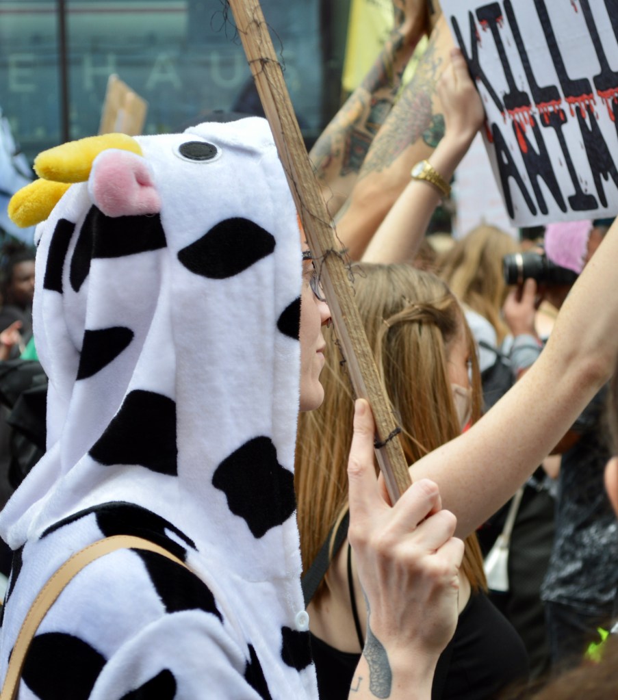 With any luck, much of the noise comes from marchers chanting slogans en masse: “There’s no excuse for animal abuse”, “Humane slaughter is a lie”, “It’s not food, it’s violence”, etc. But this year, unfortunately, with such a relatively small crowd, there was no way voices alone would carry the message, particularly as not everyone is into chanting.